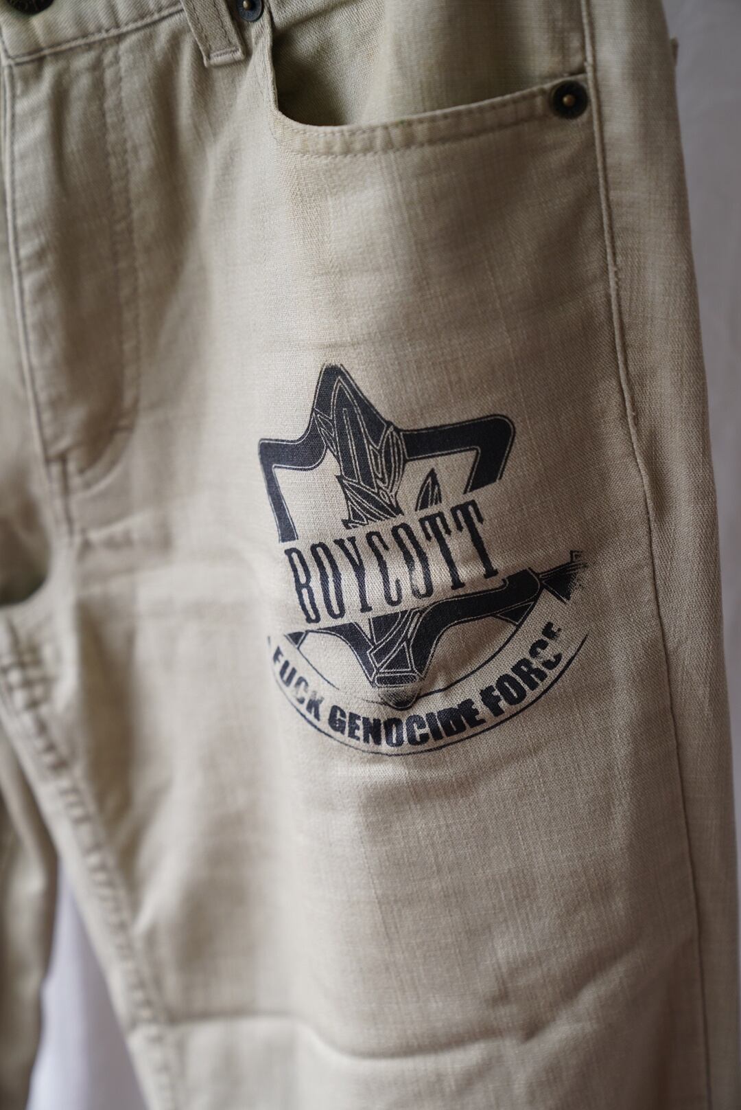 DANNY JINの代表曲「BOYCOTT」で用いられた、血塗りのイスラエル軍エムブレムを再現したデザイン。